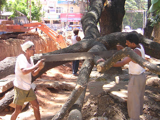 See the enclosed picture. Its taken today near my office in JP Nagar, Bangalore they are cutting trees for constructing underpass which will ease traffic and decrease the travel time to the Bangalore international airport. Tell me who is benefiting and who is suffering ??